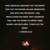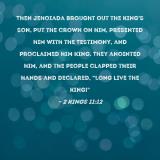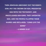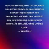 Then Jehoiada brought out the king's son, put the crown on him, presented him with the Testimony, and proclaimed him king. They anointed him, and the people clapped their hands and declared, "Long live the king!"