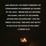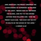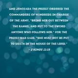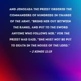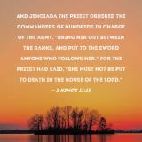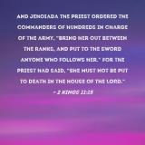 Pictures and Artwork And Jehoiada the priest ordered the commanders of hundreds in charge of the army, "Bring her out between the ranks, and put to the sword anyone who follows her." For the priest had said, "She must not be put to death in the house of the LORD." |