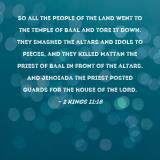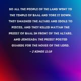 Pictures and Artwork So all the people of the land went to the temple of Baal and tore it down. They smashed the altars and idols to pieces, and they killed Mattan the priest of Baal in front of the altars. And Jehoiada the priest posted guards for the house of the LORD. |