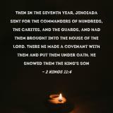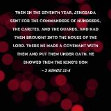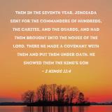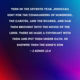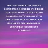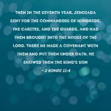 Pictures and Artwork Then in the seventh year, Jehoiada sent for the commanders of hundreds, the Carites, and the guards, and had them brought into the house of the LORD. There he made a covenant with them and put them under oath. He showed them the king's son |