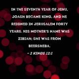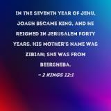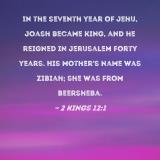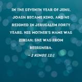 In the seventh year of Jehu, Joash became king, and he reigned in Jerusalem forty years. His mother's name was Zibiah; she was from Beersheba.