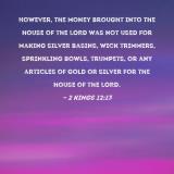 However, the money brought into the house of the LORD was not used for making silver basins, wick trimmers, sprinkling bowls, trumpets, or any articles of gold or silver for the house of the LORD.