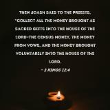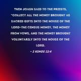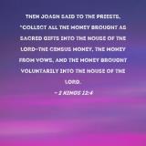 Then Joash said to the priests, "Collect all the money brought as sacred gifts into the house of the LORD--the census money, the money from vows, and the money brought voluntarily into the house of the LORD.