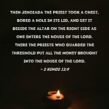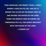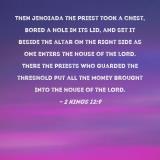 Pictures and Artwork Then Jehoiada the priest took a chest, bored a hole in its lid, and set it beside the altar on the right side as one enters the house of the LORD. There the priests who guarded the threshold put all the money brought into the house of the LORD. |