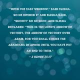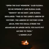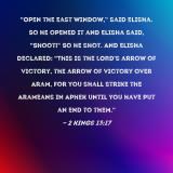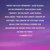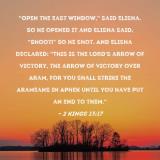 Pictures and Artwork "Open the east window," said Elisha. So he opened it and Elisha said, "Shoot!" So he shot. And Elisha declared: "This is the LORD's arrow of victory, the arrow of victory over Aram, for you shall strike the Arameans in Aphek until you have put an end to them." |