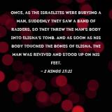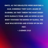 Once, as the Israelites were burying a man, suddenly they saw a band of raiders, so they threw the man's body into Elisha's tomb. And as soon as his body touched the bones of Elisha, the man was revived and stood up on his feet.