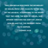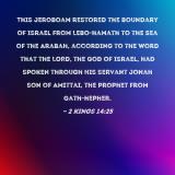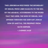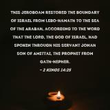 This Jeroboam restored the boundary of Israel from Lebo-hamath to the Sea of the Arabah, according to the word that the LORD, the God of Israel, had spoken through His servant Jonah son of Amittai, the prophet from Gath-hepher.