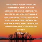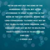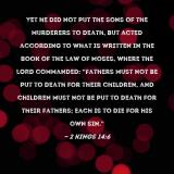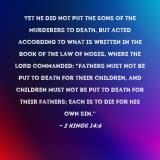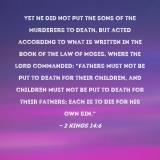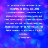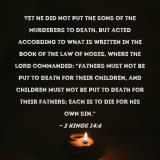 Pictures and Artwork Yet he did not put the sons of the murderers to death, but acted according to what is written in the Book of the Law of Moses, where the LORD commanded: "Fathers must not be put to death for their children, and children must not be put to death for their fathers; each is to die for his own sin." |