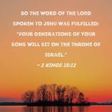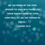 So the word of the LORD spoken to Jehu was fulfilled: "Four generations of your sons will sit on the throne of Israel."