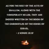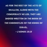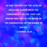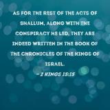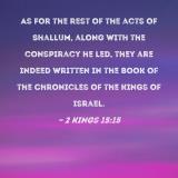 As for the rest of the acts of Shallum, along with the conspiracy he led, they are indeed written in the Book of the Chronicles of the Kings of Israel.