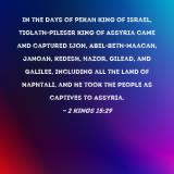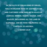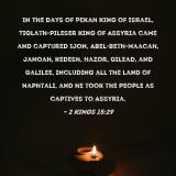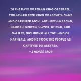 Pictures and Artwork In the days of Pekah king of Israel, Tiglath-pileser king of Assyria came and captured Ijon, Abel-beth-maacah, Janoah, Kedesh, Hazor, Gilead, and Galilee, including all the land of Naphtali, and he took the people as captives to Assyria. |