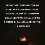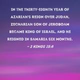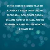 In the thirty-eighth year of Azariah's reign over Judah, Zechariah son of Jeroboam became king of Israel, and he reigned in Samaria six months.