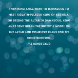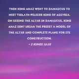Then King Ahaz went to Damascus to meet Tiglath-pileser king of Assyria. On seeing the altar in Damascus, King Ahaz sent Uriah the priest a model of the altar and complete plans for its construction.