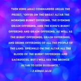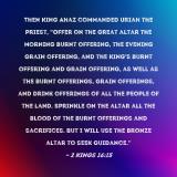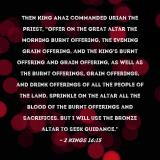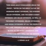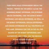 Pictures and Artwork Then King Ahaz commanded Uriah the priest, "Offer on the great altar the morning burnt offering, the evening grain offering, and the king's burnt offering and grain offering, as well as the burnt offerings, grain offerings, and drink offerings of all the people of the land. Sprinkle on the altar all the blood of the burnt offerings and sacrifices. But I will use the bronze altar to seek guidance." |