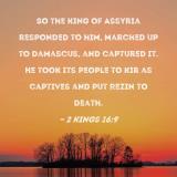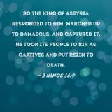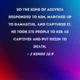 So the king of Assyria responded to him, marched up to Damascus, and captured it. He took its people to Kir as captives and put Rezin to death.