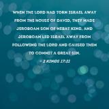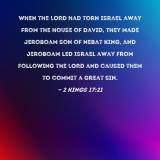 When the LORD had torn Israel away from the house of David, they made Jeroboam son of Nebat king, and Jeroboam led Israel away from following the LORD and caused them to commit a great sin.