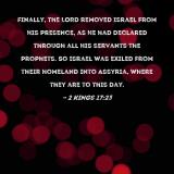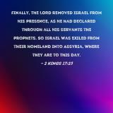 Finally, the LORD removed Israel from His presence, as He had declared through all His servants the prophets. So Israel was exiled from their homeland into Assyria, where they are to this day.