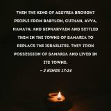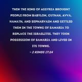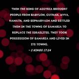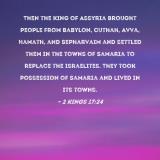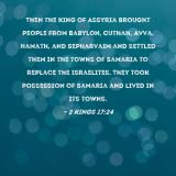 Then the king of Assyria brought people from Babylon, Cuthah, Avva, Hamath, and Sepharvaim and settled them in the towns of Samaria to replace the Israelites. They took possession of Samaria and lived in its towns.
