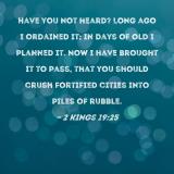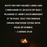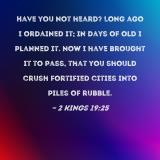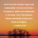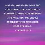 Have you not heard? Long ago I ordained it; in days of old I planned it. Now I have brought it to pass, that you should crush fortified cities into piles of rubble.