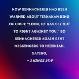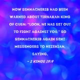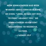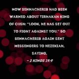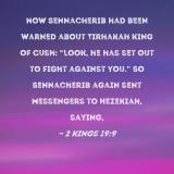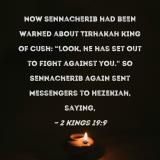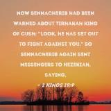 Now Sennacherib had been warned about Tirhakah king of Cush: "Look, he has set out to fight against you." So Sennacherib again sent messengers to Hezekiah, saying,