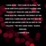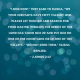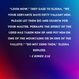 Pictures and Artwork "Look now," they said to Elisha, "we your servants have fifty valiant men. Please let them go and search for your master. Perhaps the Spirit of the LORD has taken him up and put him on one of the mountains or in one of the valleys." "Do not send them," Elisha replied. |