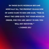 In those days Hezekiah became mortally ill. The prophet Isaiah son of Amoz came to him and said, "This is what the LORD says: 'Put your house in order, for you are about to die; you will not recover.'"