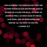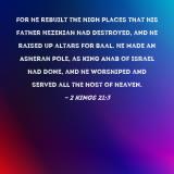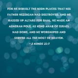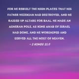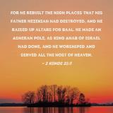 For he rebuilt the high places that his father Hezekiah had destroyed, and he raised up altars for Baal. He made an Asherah pole, as King Ahab of Israel had done, and he worshiped and served all the host of heaven.