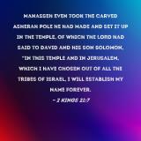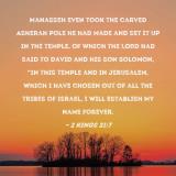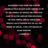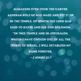 Pictures and Artwork Manasseh even took the carved Asherah pole he had made and set it up in the temple, of which the LORD had said to David and his son Solomon, "In this temple and in Jerusalem, which I have chosen out of all the tribes of Israel, I will establish My Name forever. |
