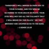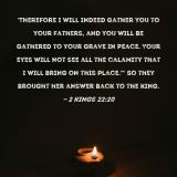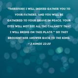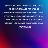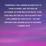 Therefore I will indeed gather you to your fathers, and you will be gathered to your grave in peace. Your eyes will not see all the calamity that I will bring on this place.'" So they brought her answer back to the king.