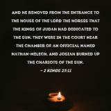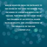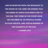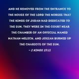 Pictures and Artwork And he removed from the entrance to the house of the LORD the horses that the kings of Judah had dedicated to the sun. They were in the court near the chamber of an official named Nathan-melech. And Josiah burned up the chariots of the sun. |