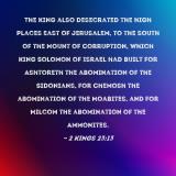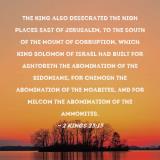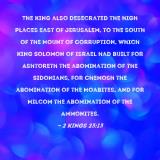 Pictures and Artwork The king also desecrated the high places east of Jerusalem, to the south of the Mount of Corruption, which King Solomon of Israel had built for Ashtoreth the abomination of the Sidonians, for Chemosh the abomination of the Moabites, and for Milcom the abomination of the Ammonites. |