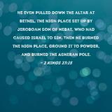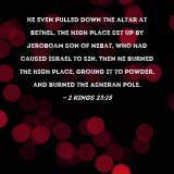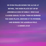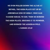 He even pulled down the altar at Bethel, the high place set up by Jeroboam son of Nebat, who had caused Israel to sin. Then he burned the high place, ground it to powder, and burned the Asherah pole.