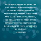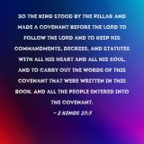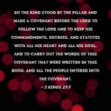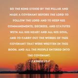 Pictures and Artwork So the king stood by the pillar and made a covenant before the LORD to follow the LORD and to keep His commandments, decrees, and statutes with all his heart and all his soul, and to carry out the words of this covenant that were written in this book. And all the people entered into the covenant. |