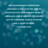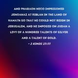 And Pharaoh Neco imprisoned Jehoahaz at Riblah in the land of Hamath so that he could not reign in Jerusalem, and he imposed on Judah a levy of a hundred talents of silver and a talent of gold.