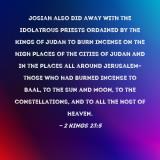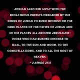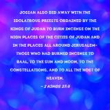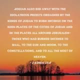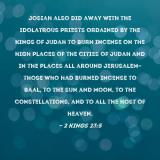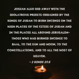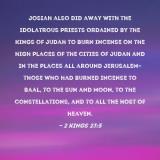 Pictures and Artwork Josiah also did away with the idolatrous priests ordained by the kings of Judah to burn incense on the high places of the cities of Judah and in the places all around Jerusalem--those who had burned incense to Baal, to the sun and moon, to the constellations, and to all the host of heaven. |