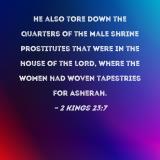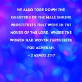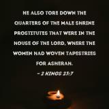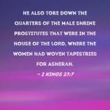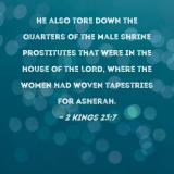 He also tore down the quarters of the male shrine prostitutes that were in the house of the LORD, where the women had woven tapestries for Asherah.