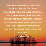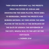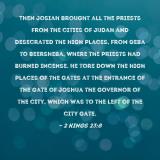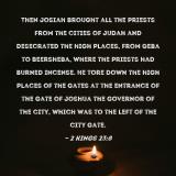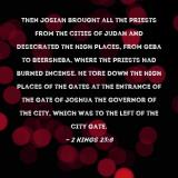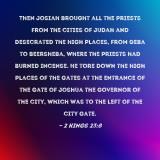 Pictures and Artwork Then Josiah brought all the priests from the cities of Judah and desecrated the high places, from Geba to Beersheba, where the priests had burned incense. He tore down the high places of the gates at the entrance of the gate of Joshua the governor of the city, which was to the left of the city gate. |