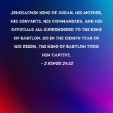 Jehoiachin king of Judah, his mother, his servants, his commanders, and his officials all surrendered to the king of Babylon. So in the eighth year of his reign, the king of Babylon took him captive.