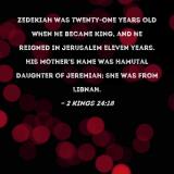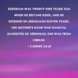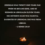Zedekiah was twenty-one years old when he became king, and he reigned in Jerusalem eleven years. His mother's name was Hamutal daughter of Jeremiah; she was from Libnah.