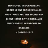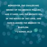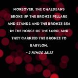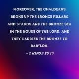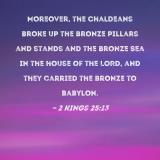 Moreover, the Chaldeans broke up the bronze pillars and stands and the bronze Sea in the house of the LORD, and they carried the bronze to Babylon.