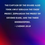 The captain of the guard also took away Seraiah the chief priest, Zephaniah the priest of second rank, and the three doorkeepers.