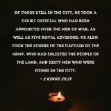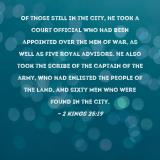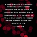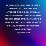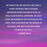 Pictures and Artwork Of those still in the city, he took a court official who had been appointed over the men of war, as well as five royal advisors. He also took the scribe of the captain of the army, who had enlisted the people of the land, and sixty men who were found in the city. |