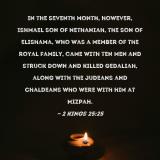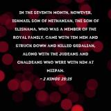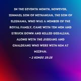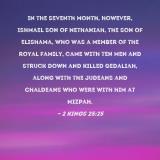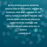 Pictures and Artwork In the seventh month, however, Ishmael son of Nethaniah, the son of Elishama, who was a member of the royal family, came with ten men and struck down and killed Gedaliah, along with the Judeans and Chaldeans who were with him at Mizpah. |