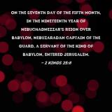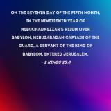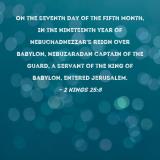 On the seventh day of the fifth month, in the nineteenth year of Nebuchadnezzar's reign over Babylon, Nebuzaradan captain of the guard, a servant of the king of Babylon, entered Jerusalem.