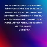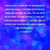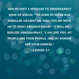 Pictures and Artwork And he sent a message to Jehoshaphat king of Judah: "The king of Moab has rebelled against me. Will you go with me to fight against Moab?" "I will go," replied Jehoshaphat. "I am like you, my people are your people, and my horses are your horses." |