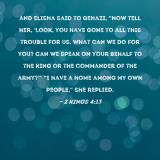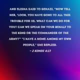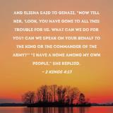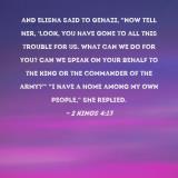 Pictures and Artwork and Elisha said to Gehazi, "Now tell her, 'Look, you have gone to all this trouble for us. What can we do for you? Can we speak on your behalf to the king or the commander of the army?'" "I have a home among my own people," she replied. |