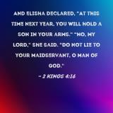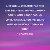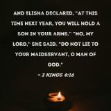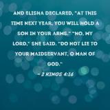 And Elisha declared, "At this time next year, you will hold a son in your arms." "No, my lord," she said. "Do not lie to your maidservant, O man of God."