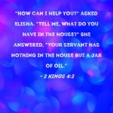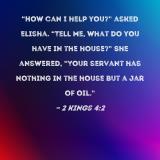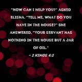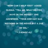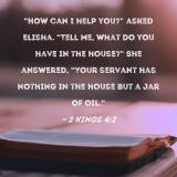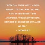 "How can I help you?" asked Elisha. "Tell me, what do you have in the house?" She answered, "Your servant has nothing in the house but a jar of oil."