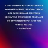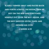 Elisha turned away and paced back and forth across the room. Then he got on the bed and stretched himself out over the boy again, and the boy sneezed seven times and opened his eyes.