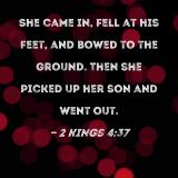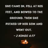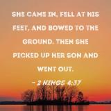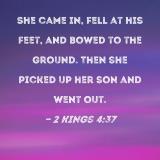 She came in, fell at his feet, and bowed to the ground. Then she picked up her son and went out.